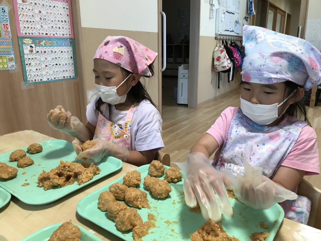 写真は寝かせた味噌を丸めて「味噌玉」を作っているところです。味噌のにおいをかぎながら、皆、真剣に丸めていました。「味噌玉」を容器に入れて再び寝かせ、12月頃には味噌が仕上がる予定です。