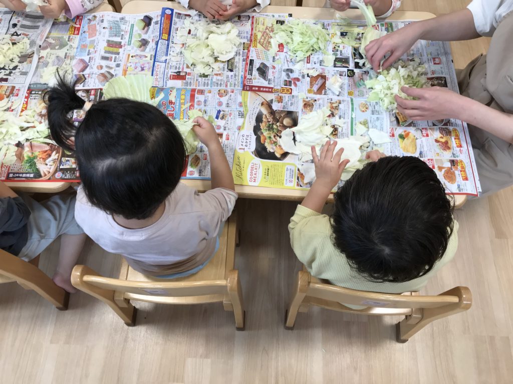 そよかぜぐみ(2歳児クラス)さんが、給食室のお手伝いとして、キャベツちぎりとチンゲン菜ちぎりをしました。