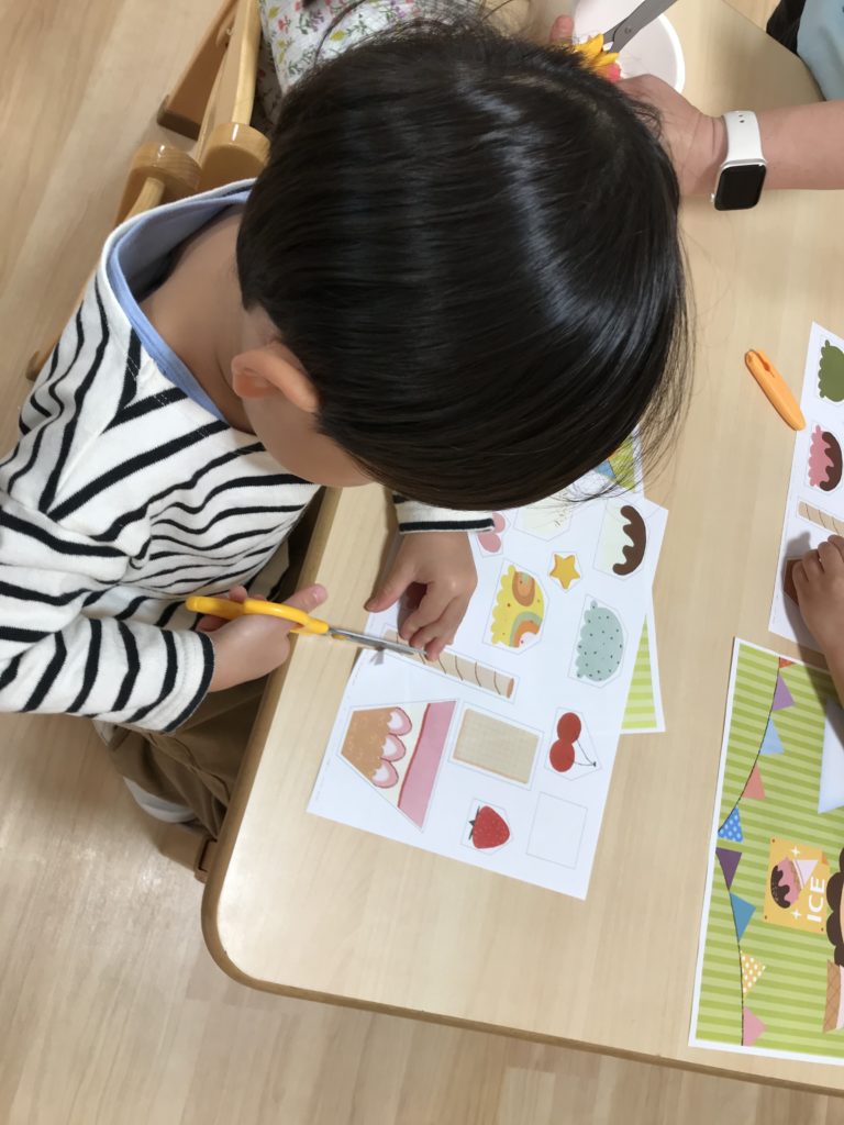 少しずつ正しい持ち方ではさみを持ち、スムーズに切れるようになってきた子ども達。はさみを使用している時は、気付くと話し声が聞こえなくなり、皆、真剣に取り組んでいることが分かります。