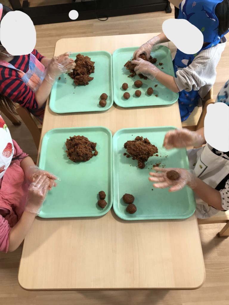 調理師からの説明では「てんちがえし」=「味噌をかき混ぜて発酵兄弟が動けるようにしてあげよう!」という説明の元、再度、味噌を出して綺麗に丸めた子ども達。5月の頃よりも味噌の色が濃くなっていること、味噌のにおいが強くなっていることを肌で感じていました。